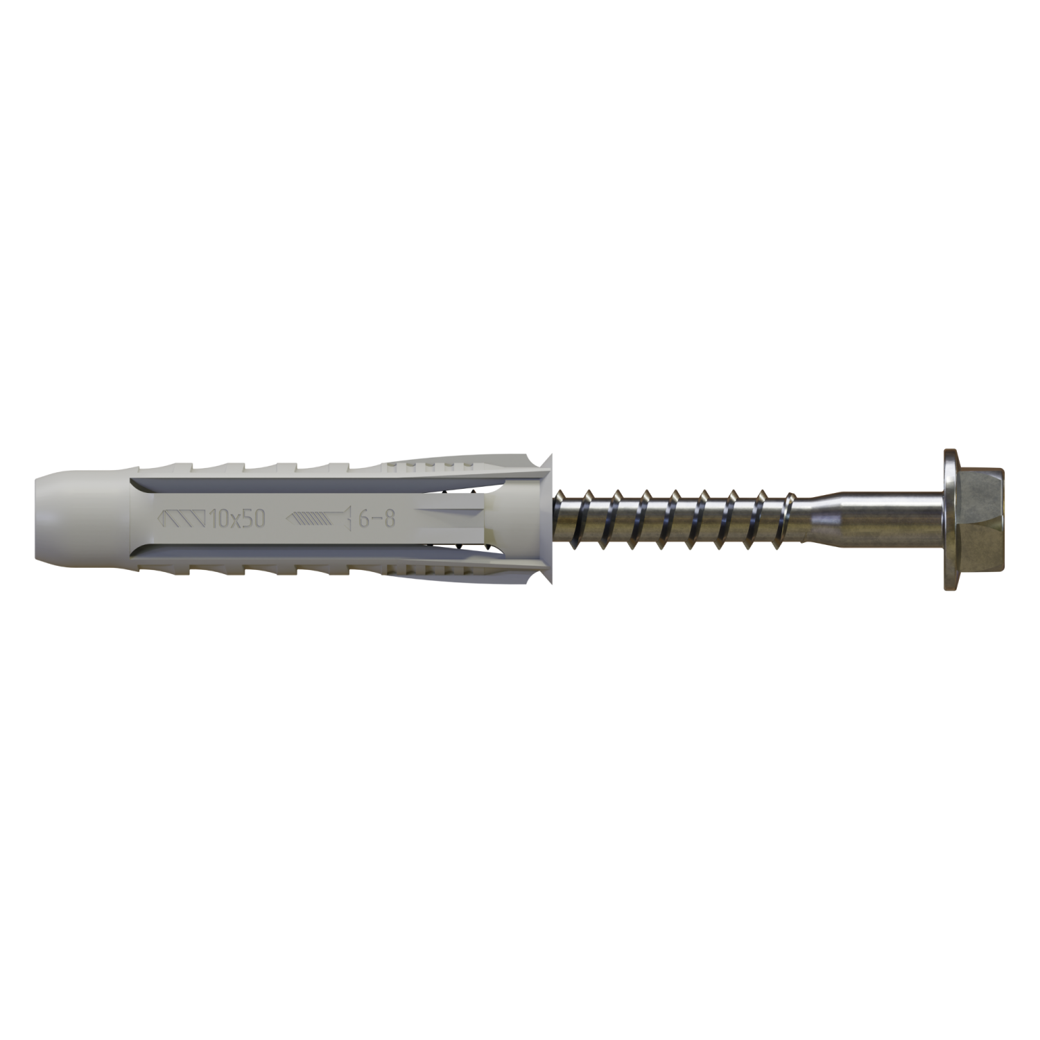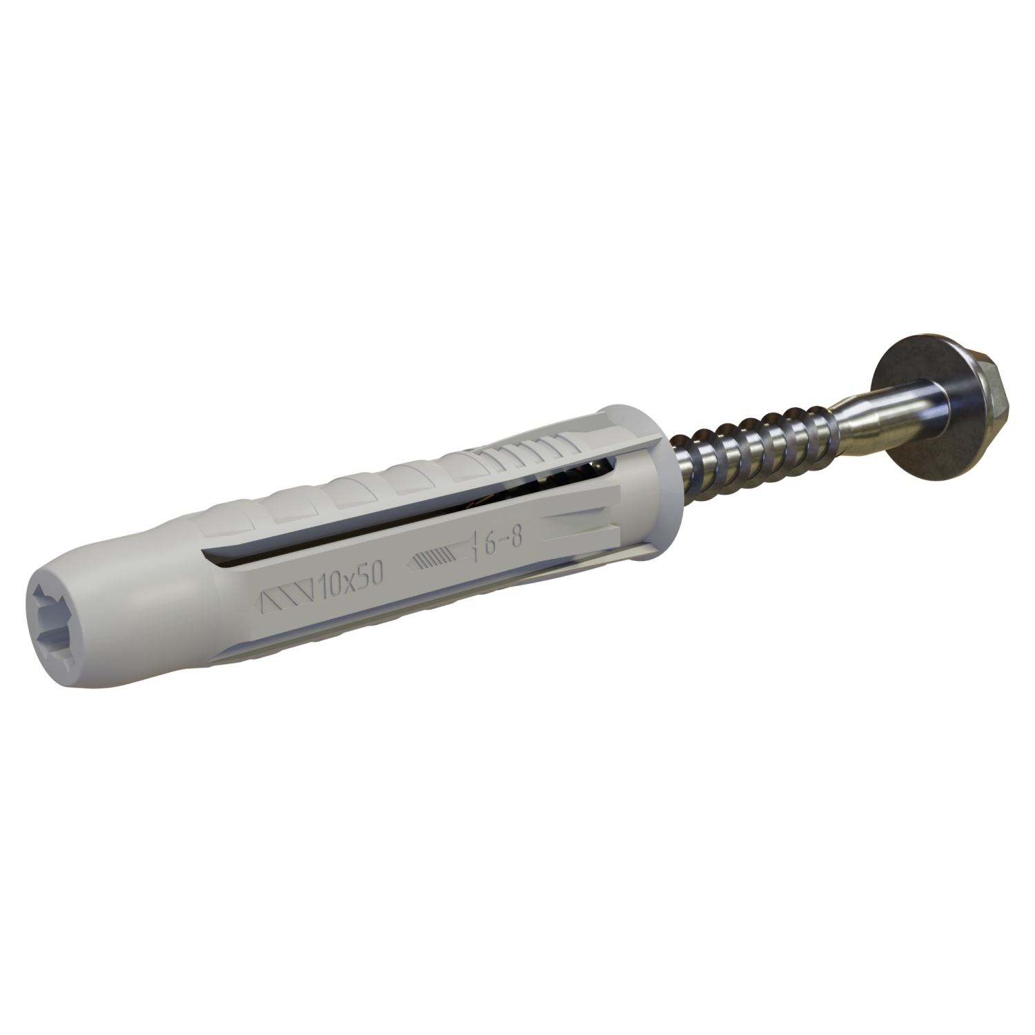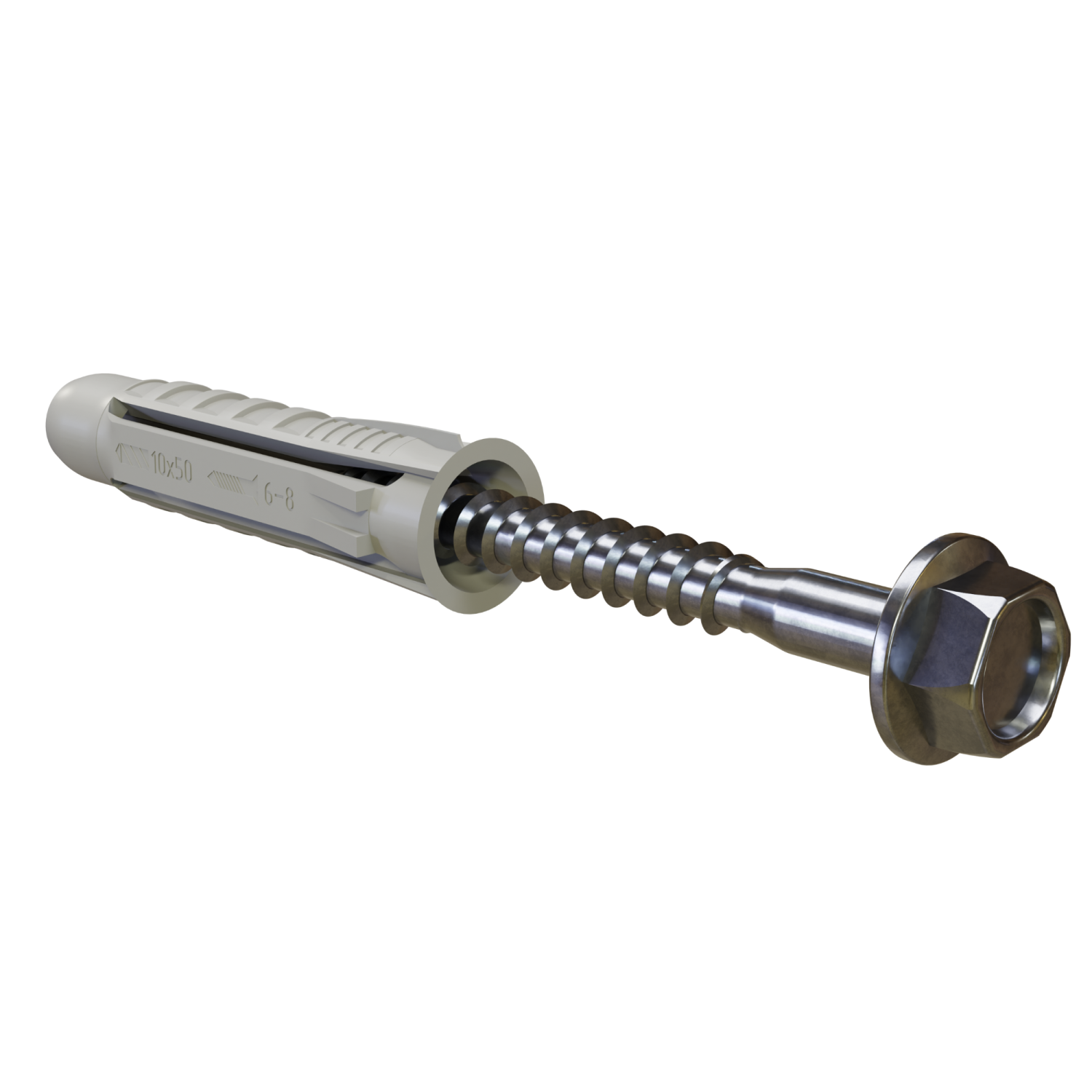 Un dop de expansiune universal profesional cu un șurub cu cap hexagonal este un accesoriu profesional de asamblare. Manșonul din poliamidă este montat într-un orificiu găurit în substrat și apoi se instalează un șurub din oțel galvanizat cu cap hexagonal și o cheie cu cap deschis.